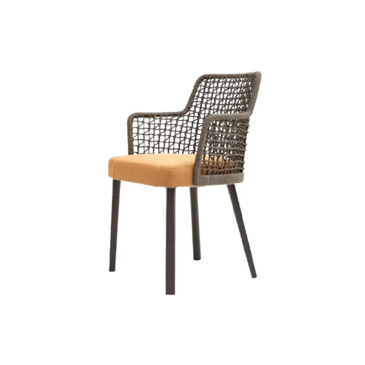 This elegant dining room chair is crafted with a powder-coated aluminium frame and hand-woven olefin rope. The plush cushion features 32-density filler-free PU foam, upholstered in premium 100% solution-dyed acrylic fabric from Agora (Spain) and Sunbrella (France). Removable, hand-washable covers ensure easy maintenance. Higher-density foam available on request.