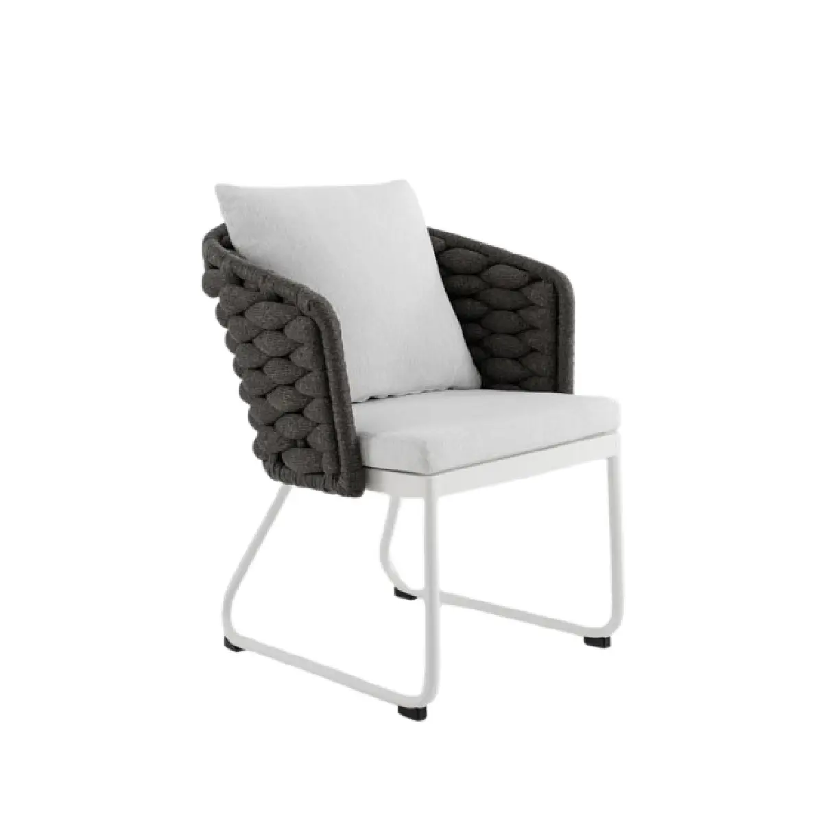 This elegant dining room chair is crafted with a powder-coated aluminium frame and hand-woven olefin rope. The plush cushion features 32-density filler-free PU foam, upholstered in premium 100% solution-dyed acrylic fabric from Agora (Spain) and Sunbrella (France). Removable, hand-washable covers ensure easy maintenance. Higher-density foam available on request.