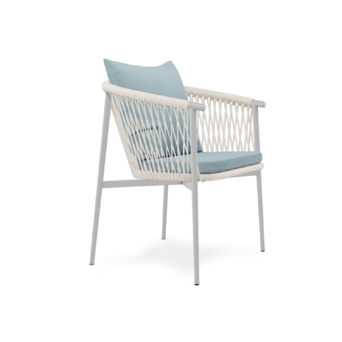 This elegant dining room chair is crafted with a powder-coated aluminium frame and hand-woven olefin rope. The plush cushion features 32-density filler-free PU foam, upholstered in premium 100% solution-dyed acrylic fabric from Agora (Spain) and Sunbrella (France). Removable, hand-washable covers ensure easy maintenance. Higher-density foam available on request.