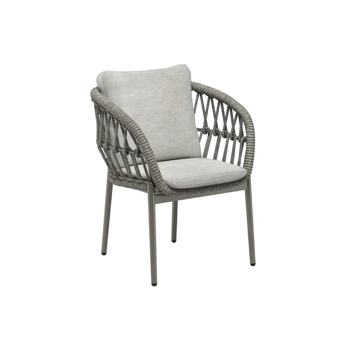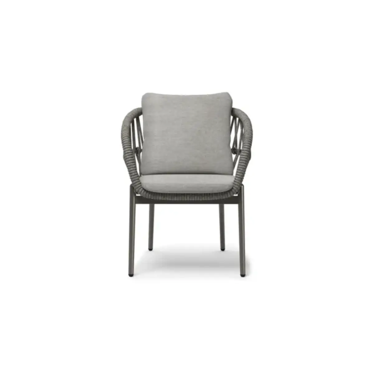 This elegant dining room chair is crafted with a powder-coated aluminium frame and hand-woven olefin rope. The plush cushion features 32-density filler-free PU foam, upholstered in premium 100% solution-dyed acrylic fabric from Agora (Spain) and Sunbrella (France). Removable, hand-washable covers ensure easy maintenance. Higher-density foam available on request.